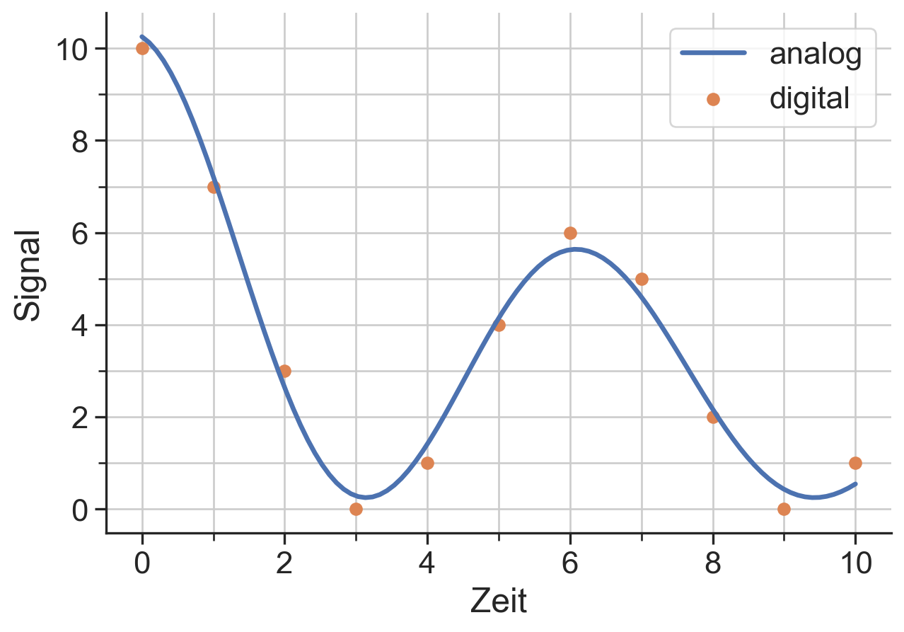 Ein digitales Signal besteht aus diskreten Werten – meist zwei: 0 und 1. Es wird also in einzelnen Schritten dargestellt und ist damit für Computer besonders gut geeignet. Die kontinuierlichen Werte der realen Welt müssen dafür zunächst in digitale Werte umgewandelt werden (Analog-Digital-Wandlung).