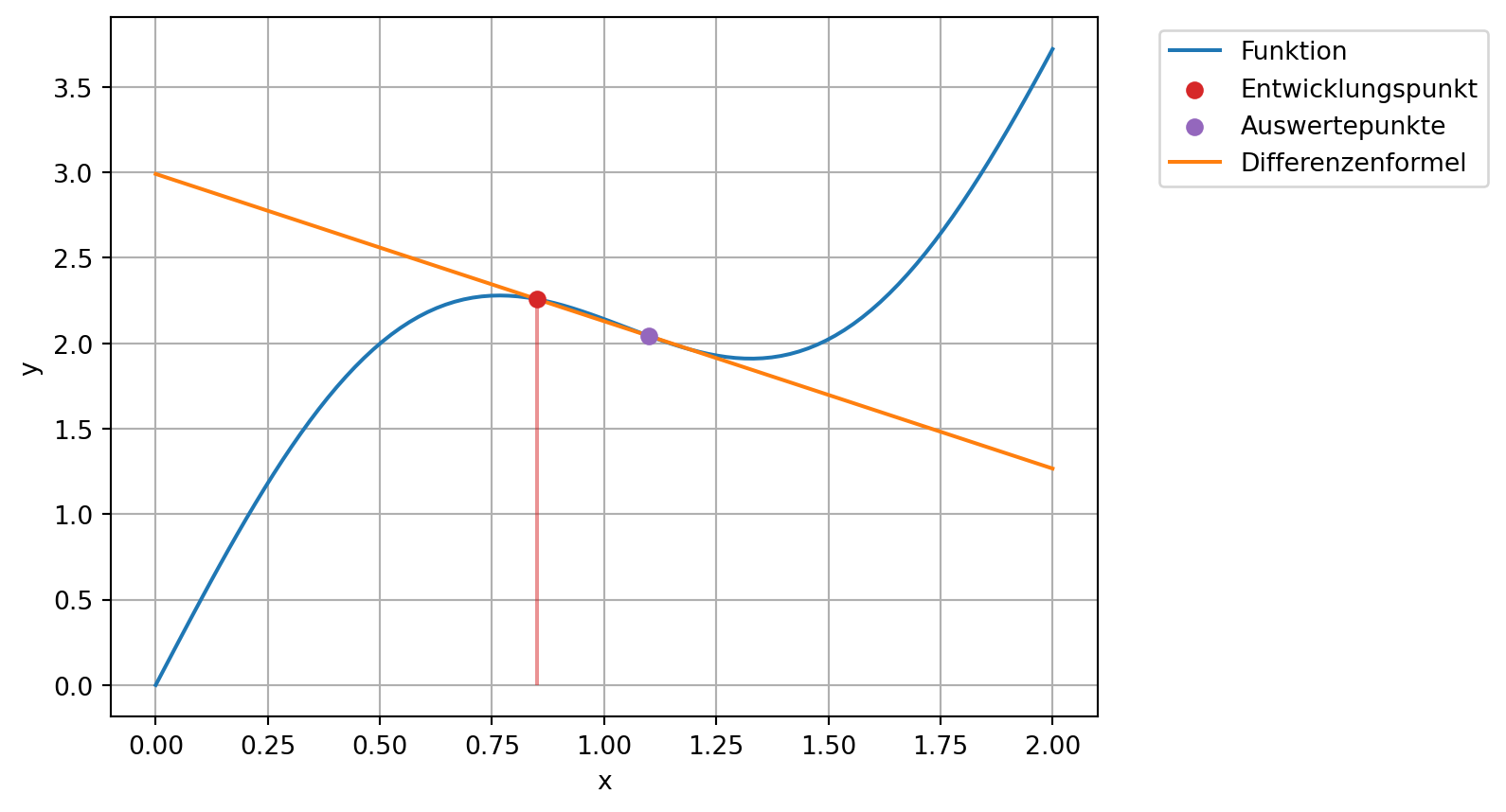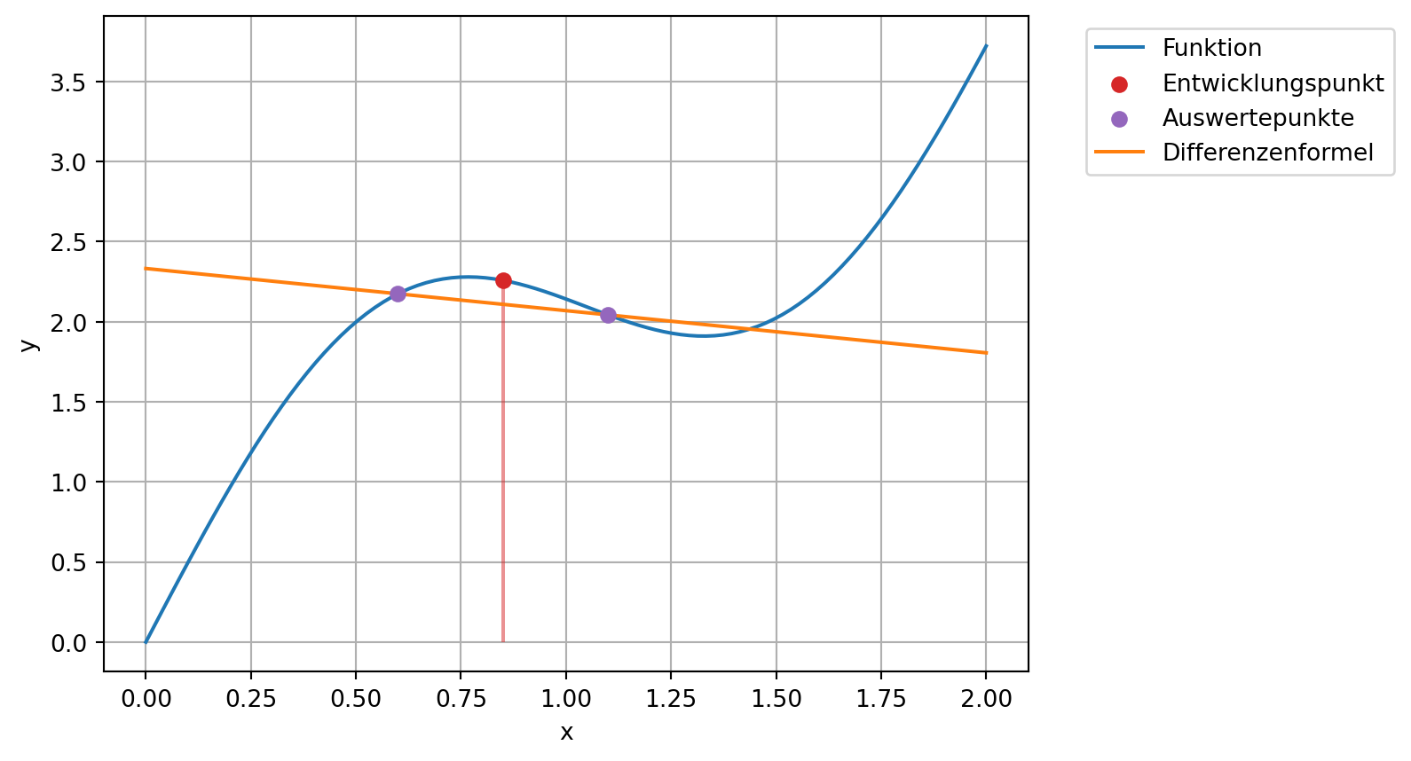 plt.scatter([x0], [f0], color-h, x0+h], [fnh, fph], color='C4', label='Auswertepunkte', zorder=3)