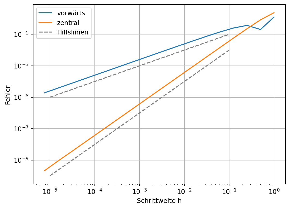 In der logiarithmischen Darstellung beider Achsen werden Potenzfunktionen zu Graden mit dem Potenzgrad als Steigung. Das bedeutet, dass der Fehler im obigen Plot sich wie eine Potenzfunktion mit dem Grad eins bzw. zwei verhält. Die eingezeichneten Hilfslinien haben eine Steigung von eins bzw. zwei. Dies entspricht auch der Ordnung \(\mathsf{\mathcal{O}(h)}\) bzw. \(\mathsf{\mathcal{O}(h^2)}\) aus der Differenzenformel.