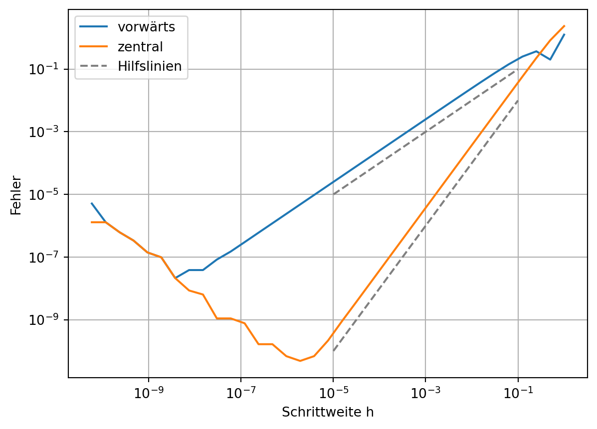 Mit \(\mathsf{\epsilon \approx 10^{-16}}\) ist für diese Differenzenformel ein \(\mathsf{h}\) nur bis etwa \(\mathsf{10^{-8}}\) angemessen.