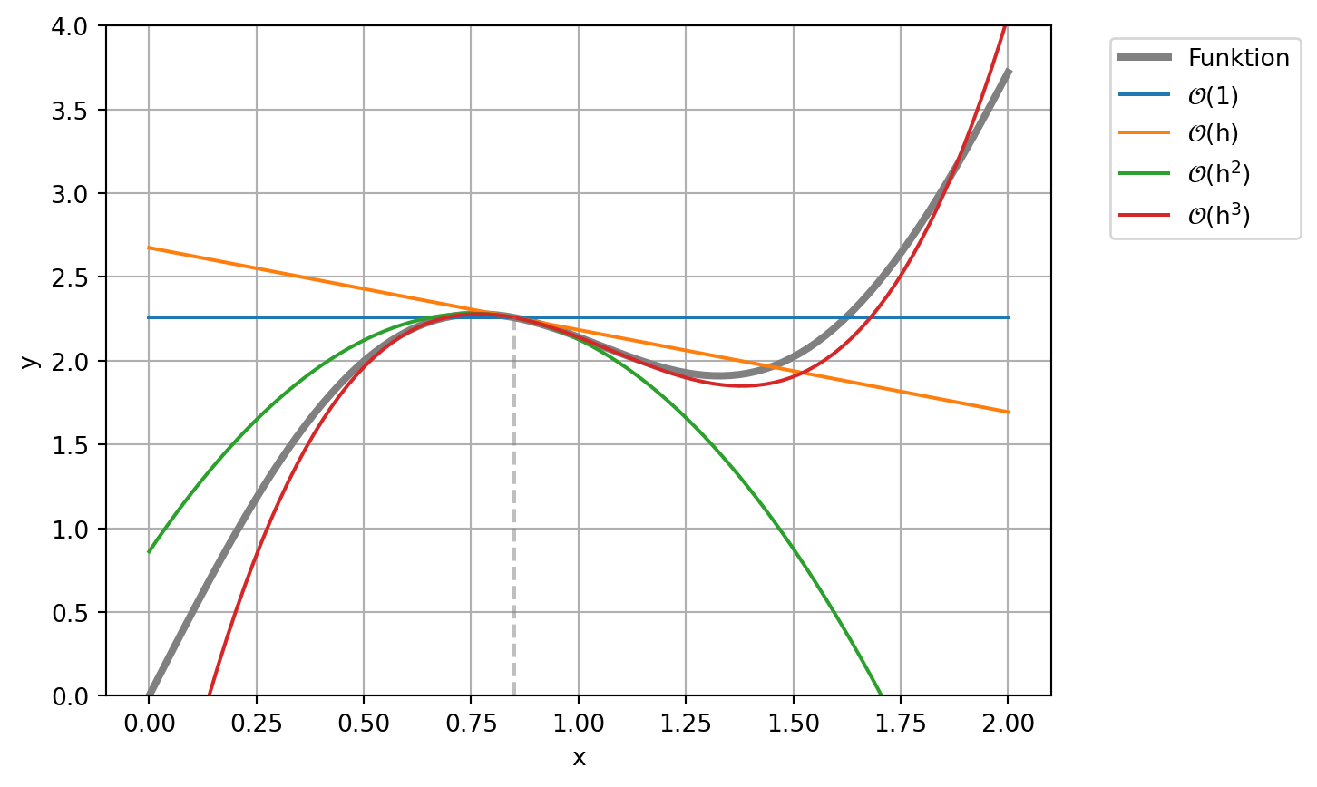 Hierbei deutet das Landau-Symbol \(\mathsf{\mathcal{O}}\) die Ordnung an, welche die vernachlässigten Terme, hier ab \(\mathsf{h^3}\), als Approximationsfehler zusammenfasst. Die Ordnung gibt an wie schnell bzw. mit welchem funktionalem Zusammenhang der Approximationsfehler gegen Null läuft für \(\mathsf{h \rightarrow 0}\).