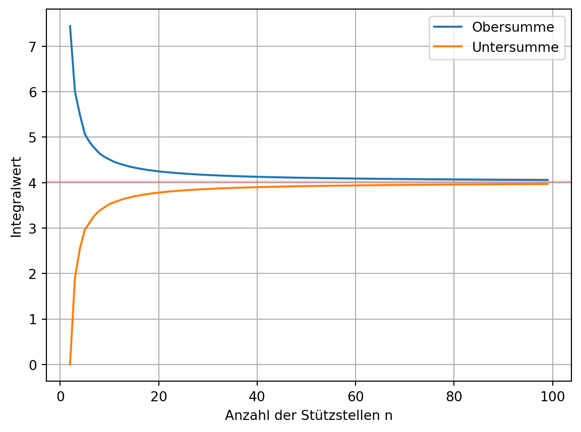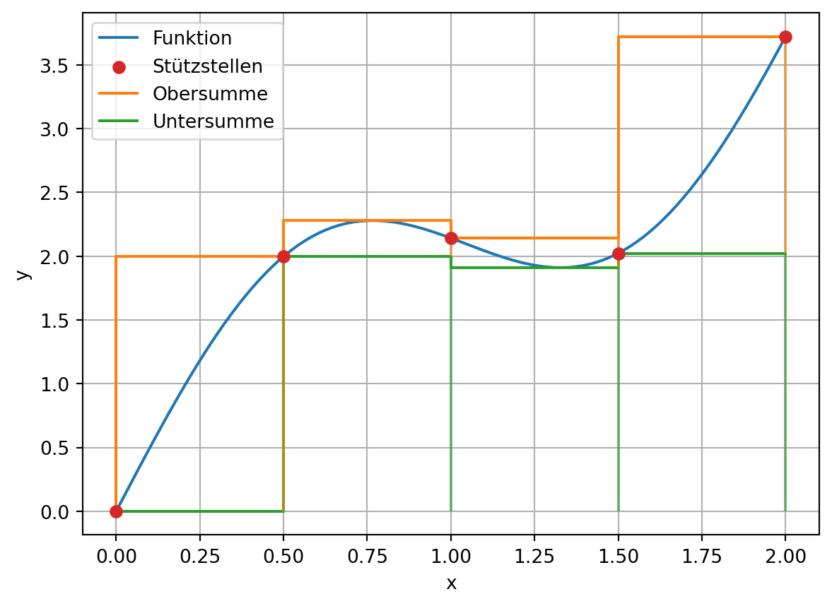 Eine der grundlegendsten Arten Integrale von Funktionen zu bestimmen sind die Ober- und Untersumme. Sie nähern den Integralwert durch eine Abschätzung nach oben bzw. unten an. Mit einer steigenden Anzahl von Stützstellen, d.h. Positionen an welchen die Funktion ausgewertet wird, konvergieren beide Abschätzungen gegen den Integralwert.