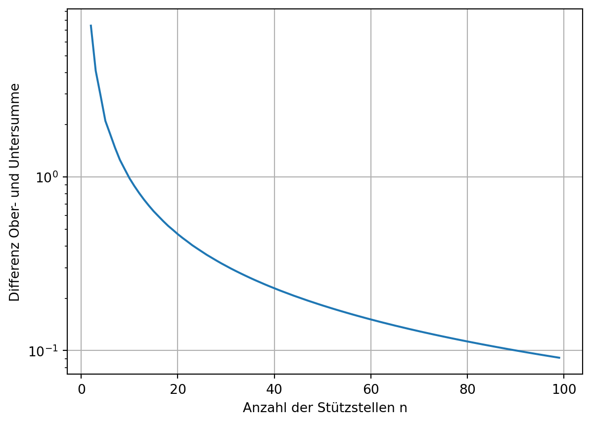 Dies wird insbesondere deutlich, wenn die Differenz der beiden Summen aufgetragen wird. Mit einer logarithmischen Darstellung kann die kontinuierliche Annäherung auch quantitativ abgelesen werden.