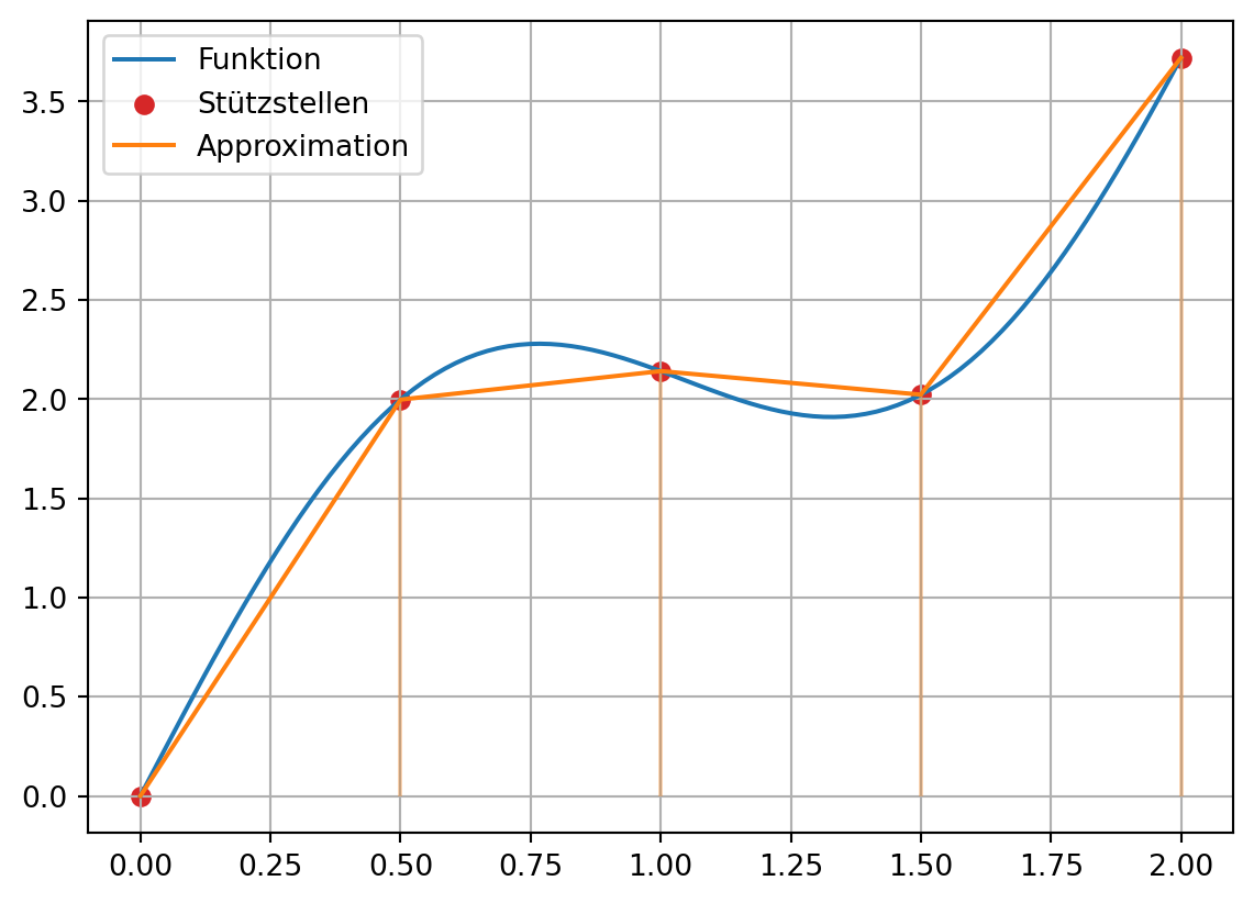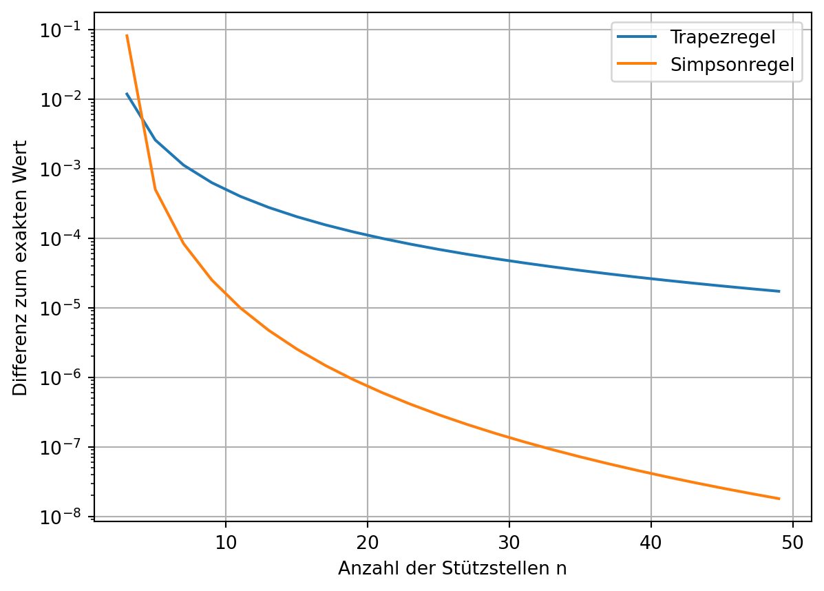 I print(f"Integralwert für {n} Stützstellen: {I:.4f}")
