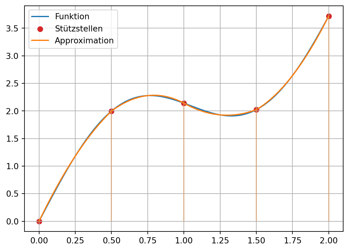 Als erstes werden die Stützstellen gleichmäßig im Intervall \(\mathsf{[0,2]}\) verteilt.