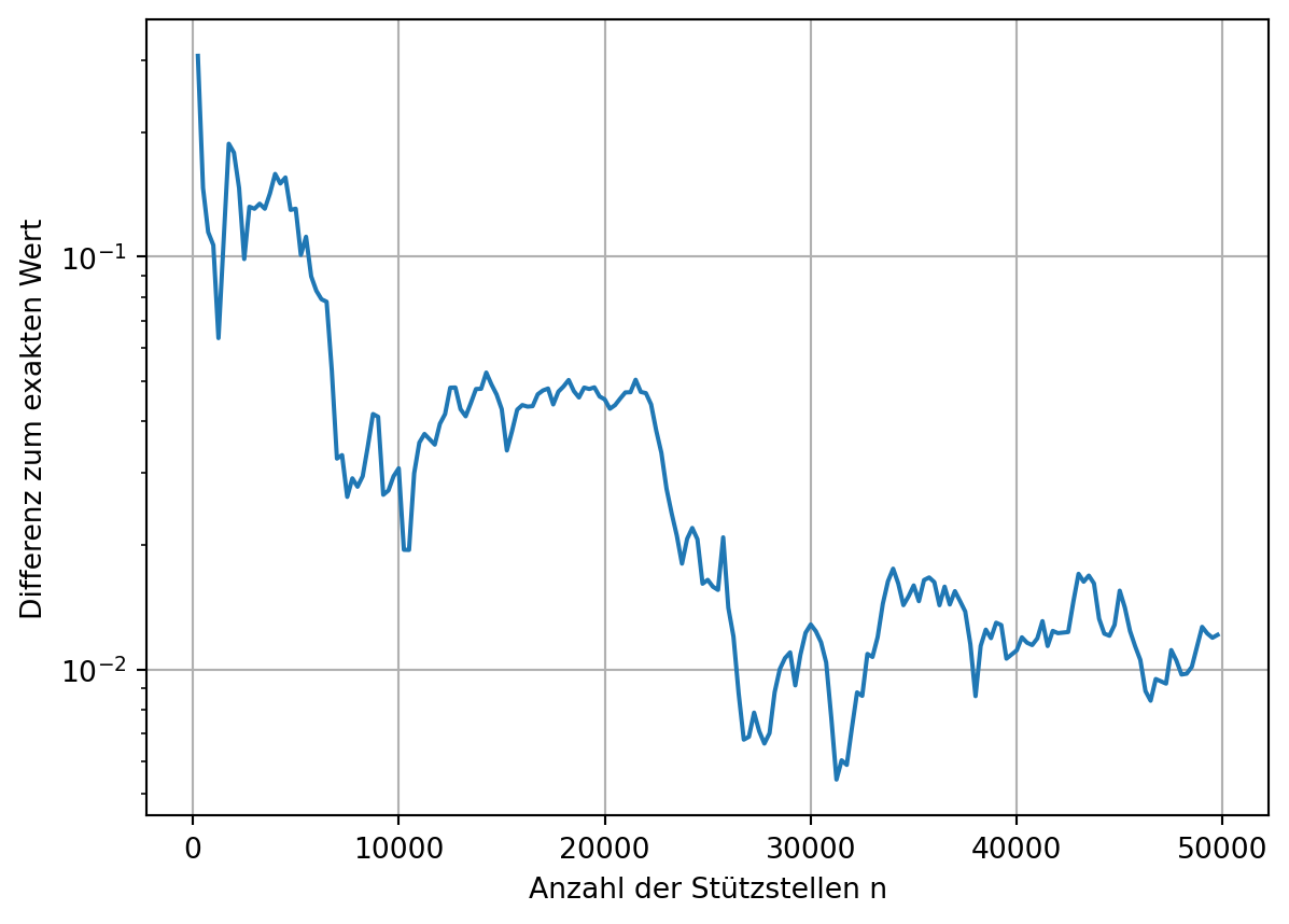 Ein ganz anderer Ansatz zur Integration wird mit dem Monte-Carlo-Ansatz verfolgt. Hierbei werden Zufallspunkte \(\mathsf{x_i}\) innerhalb der gesuchten Integralbereichs generiert. Der Mittelwert der dazugehörigen Summe der Funktionswerte \(\mathsf{f(x_i)}\) nähert das Integral an. Insbesondere für eine kleine Anzahl von Zufallswerten kann das Ergebnis deutlich vom exakten Wert abweichen. Der Vorteil des Verfahrens wird bei hochdimensionalen Integralen deutlich.
